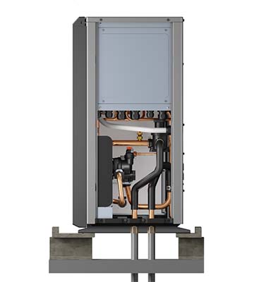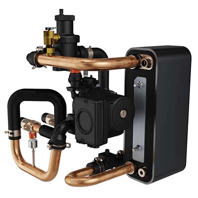 | Napojení topné vody je nově možné ze zadní i spodní strany, což umožňuje flexibilitu instalace. Vývod je 1" provedení vnější závit, propojení je nutné dodržet cu 28mm. | Kompletně vybavená jednotka obsahuje oběhové čerpadlo, odvzdušňovací a pojišťovací ventil, deskový nerezový výměník PHEX SWEP a průtokoměr. |