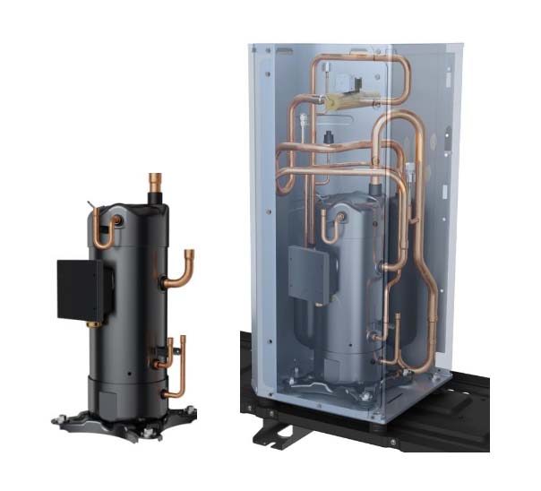| Uspořádání komponentů monobloku R290, 1-vrtulové provedení ve všech výkonech 9-16kW. | Nová generace Scroll kompresorů společnosti LG, novinkou je plovoucí uložení kompresoru, což eliminuje vibrace. |